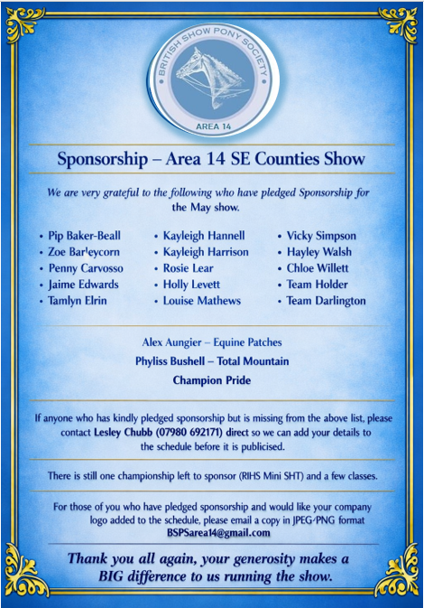 BSPS AREA 14 would like to give a massive thank you to everyone who has kindly sponsored our 2026 Area 14 SE Counties Show.